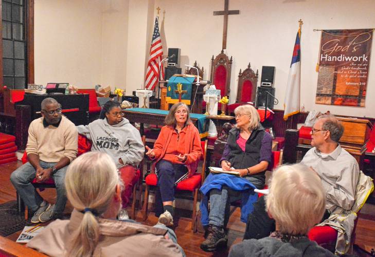Roger Wallace, left, and Mareatha Wallace, second from left, who are members of the congregation at Goodwin Memorial A.M.E. Zion Church in Amherst, discuss the church’s upcoming fundraiser with members of Interfaith Opportunity Network, who are, from left, Dorothy Cresswell, of First Church Amherst, Ruth Hazzard, of Mt. Toby Friends Meeting, and Peter Blood, also of Mt. Toby, Wednesday, Oct. 9, 2019 at Goodwin. In front are Robert Predmore, of Wesley United Methodist Church, and Lee Bridegam, of Amherst South Congregational Church.